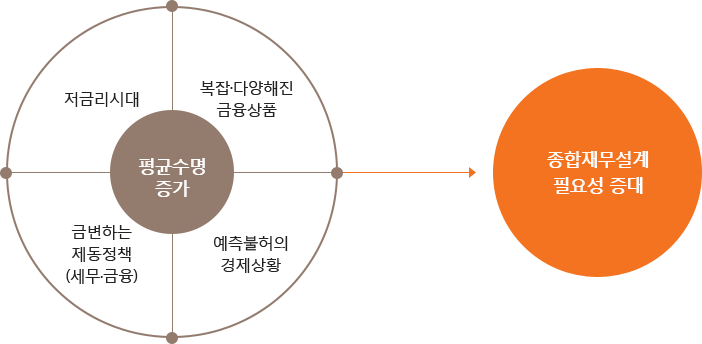 평균수명증가(저금리시대, 복잡·다양해진 금융상품, 급변하는 제동정책(세무·금융),예측불허의 경제상황) 종합재무설계 필요성 증대