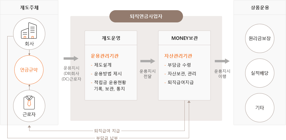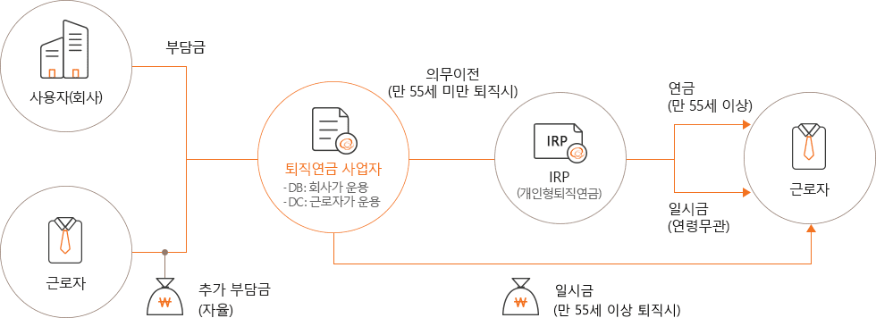퇴직연금제도는 근로자들의 노후 소득보장과 생활 안정을 위해 근로자 재직기간 중 사용자가 퇴직급여 지급 재원을 금융회사에 적립하고, 이 재원을 사용자(기업) 또는 근로자가 운용하여 근로자 퇴직 시 연금 또는 일시금으로 지급하는 제도 입니다.