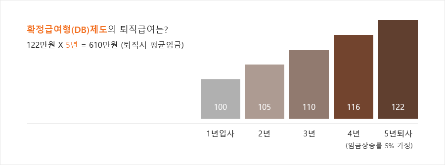 확정급여형(DB)제도의 퇴직급여는? 122만원x5년 = 610만원 (퇴직시 평균 임금)