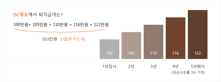 1년입사:100, 2년:105, 3년:110, 4년:116, 5년퇴사:122 (임금상승률 5% 가정)